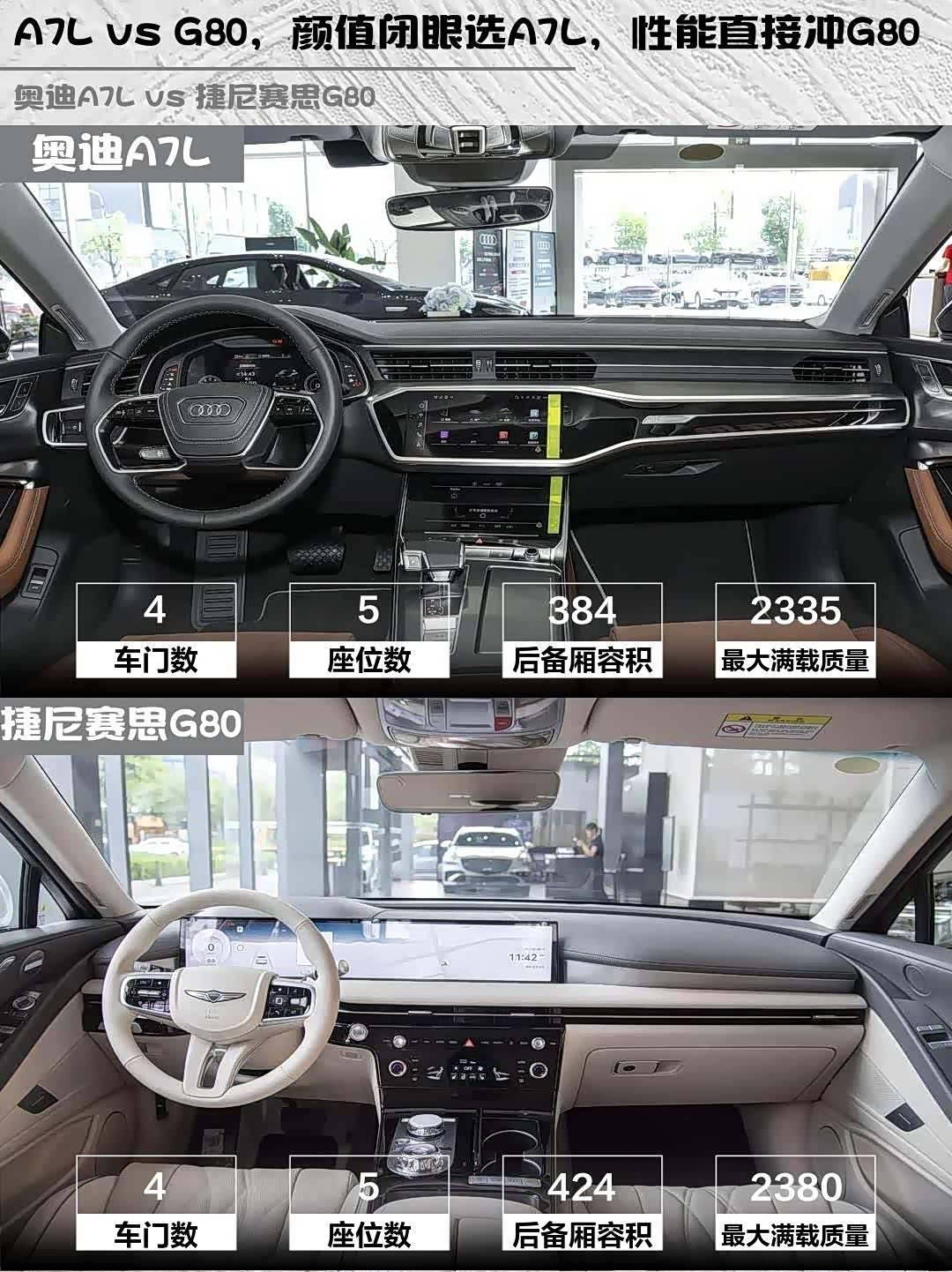 空间方面,A7L后排腿部两拳半,后备箱384L够用;G80后排包裹性强,424L后备箱更能装。配置上A7L有电动天窗+全液晶仪表,G80则标配L2辅助驾驶+座椅通风,各有胜负。