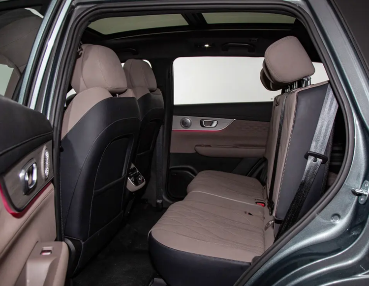 另外就是安全性很高,在国产品牌里,我就认可奇瑞的安全,尤其是白车身均采用高硬度钢材,包括前后保险杠都是加宽加厚那种,如果你比较追求家人的安全性,那么风云T8不会让你失望的。那它后排空间是很宽敞的,缺点就是座椅填充很厚实很硬,换个角度来看就很耐用,多年以后坐垫也不会塌陷,就是前期的乘坐质感并不好。后排也是普及空调出风口,拉面面板、氛围灯和镀铬材质,包括全景天窗也有,那它的后排空间也很灵活,如果七座版本也可以把第三排座椅放倒,只是七座版本并不实用,因为腿部空间十分紧凑。