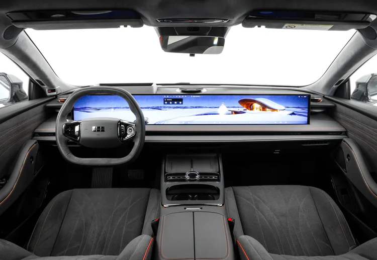 来到内饰,银河E8的问题在于纯电动车,这个劝退很多潜在用户,如果有插混版本或许销量直接飙升了。然后与B级油车相比,银河E8的产品力过剩,只是说银河E8的产品自身瞄定了一些小众群体,所以销量就没有那么高。银河E8内饰用料都没问题,你看车顶、车门和座椅都用到这种绒面材质,摸起来质感很舒服很柔软,然后也普及了座椅加热通风,还有红线勾勒出运动属性,就用料上还是非常厚道的。那L2辅助也普及了自适应巡航、360°影像和大天窗,还有年轻人喜欢的无框门也配上了。所以在配置层面上是没毛病,包括前排无线充、模式选择和水杯架都有,最大看点就是这块45英寸的大屏,也是普及了HUAWEI HiCar、Carlink、Flyme Link功能。
