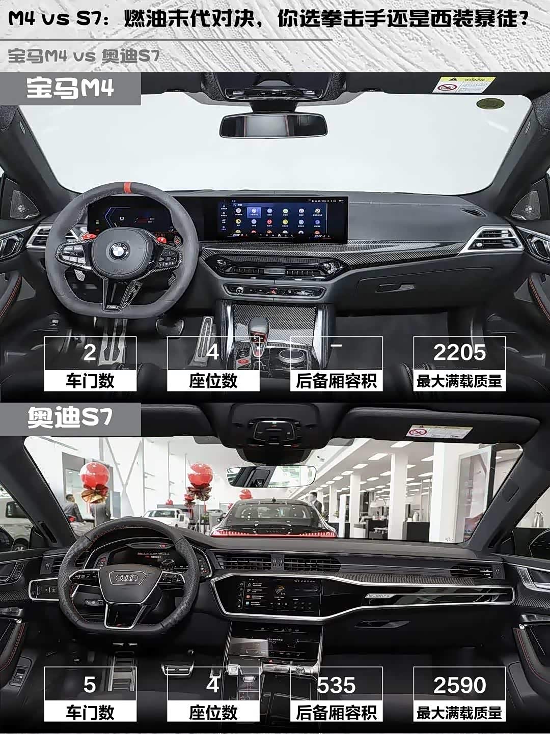 要纯粹驾驶乐趣就选M4,S58机皇+纽博格林调校的底盘会让你每次踩油门都笑出声;但如果你需要兼顾商务接待又想偶尔撒野,S7的阿斯卡里蓝车漆配银色后视镜的气场,绝对能让客户和妹子都眼前一亮。