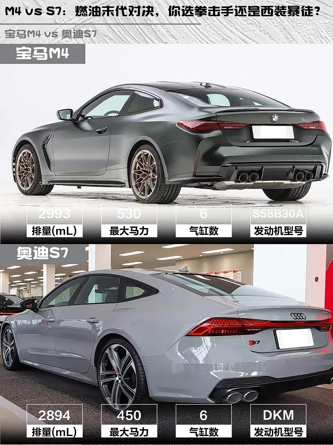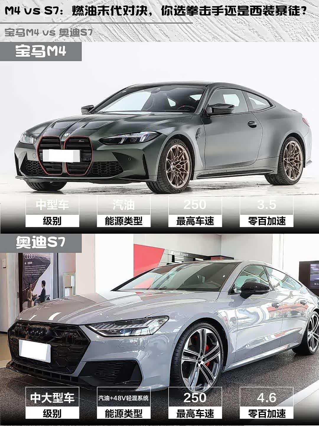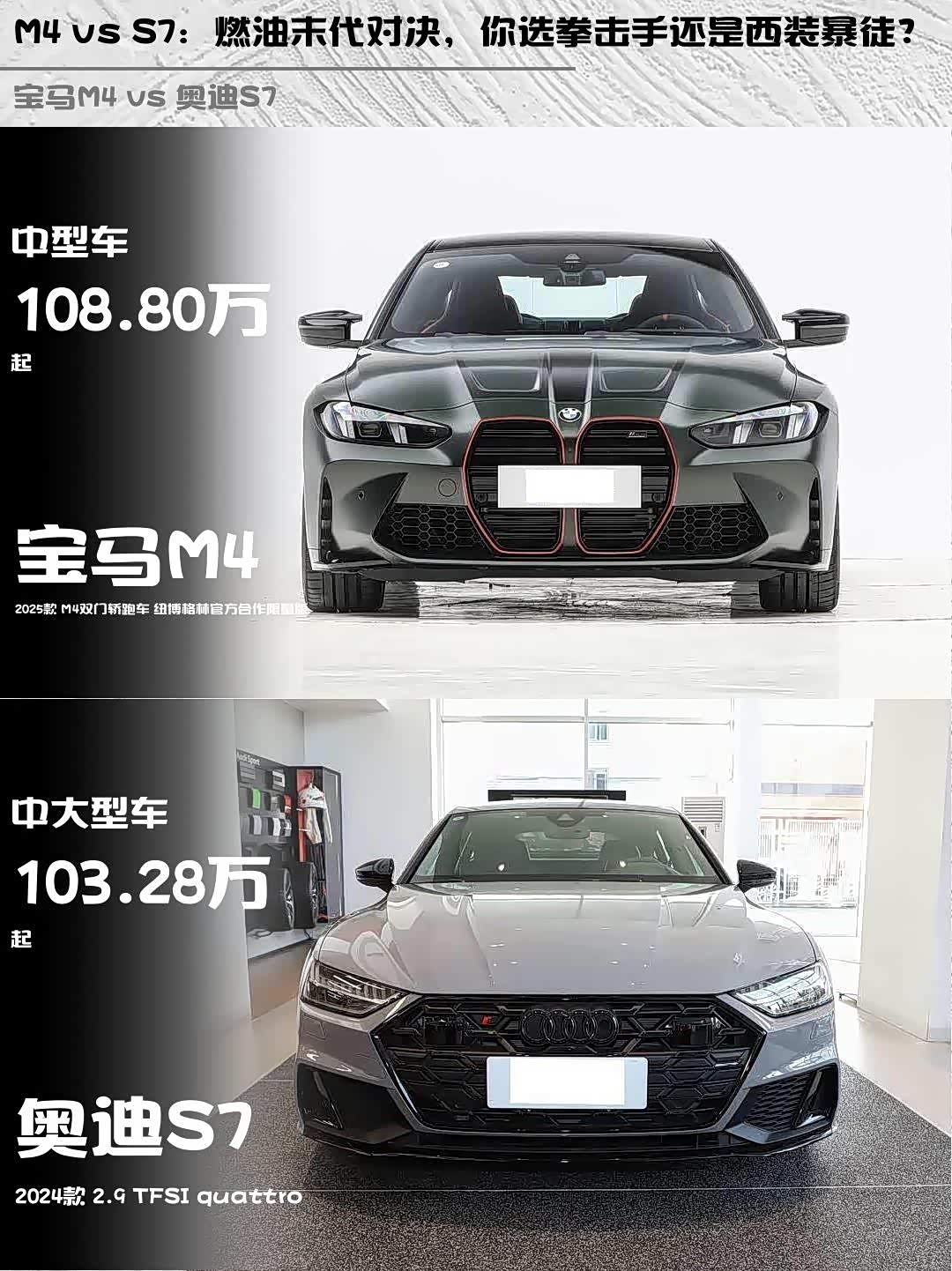宝马M4(参数|询价) 2025款 M4双门轿跑车 纽博格林官方合作限量版 vs 奥迪S7 2024款 2.9 TFSI quattro,这两台百万级性能车到底该怎么选?作为深度体验过两台车的玩家,掏心窝子分享真实对比感受!🔥