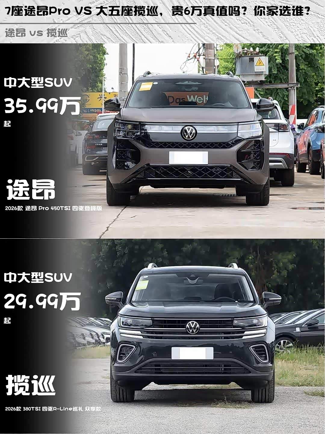 车家号·0浏览·2026-02-24 09:00 · 北京最近在选车的小伙伴看过来!今天深度对比两款热门中大型SUV——2026款 途昂(参数|询价)Pro 450TSI四驱登峰版和2026款揽巡380TSI四驱R-Line巡礼众享款,实测干货奉上🔥