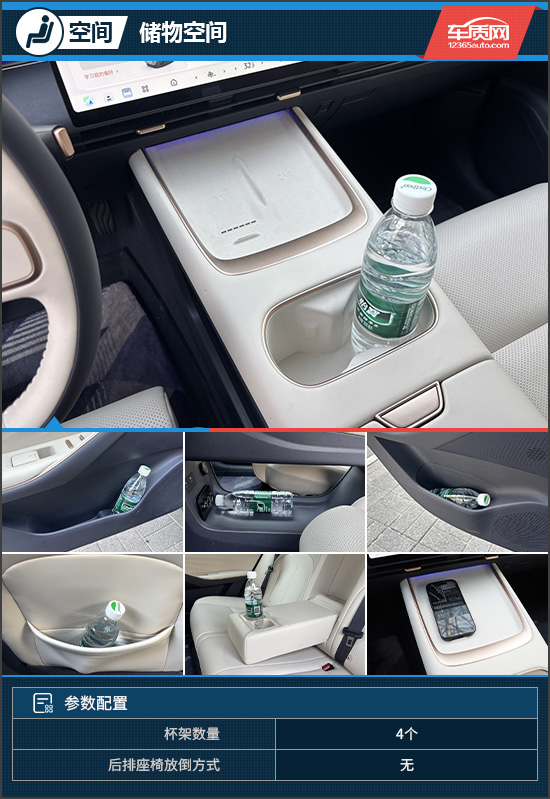 储物表现方面,评测车能够满足日常使用需求。中控台前方设置两个手机置物板,其中左侧支持无线充电;其后方配备带限位器的双杯架,下方还预留了容积可观的镂空储物空间。此外,车内还提供扶手储物槽、挂钩以及主驾螺纹拓展口等多处实用收纳点,便于放置随身物品。