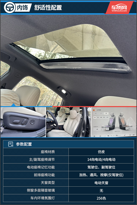 舒适性配置方面,评测车配备电动天窗,虽不及目前流行的全景天幕通透,但仍可满足日常通风与采光需求。座椅部分延续了品牌一贯的舒适取向,AI零压云毯座椅采用Spinal人体工学造型,并结合体感分区舒压缓振结构与自适应体态AI算法,能够在长时间乘坐时有效缓解疲劳,带来更为放松的乘坐体验。配置方面,前排座椅支持加热与通风功能,驾驶位还配备按摩功能,进一步提升了整体舒适性。