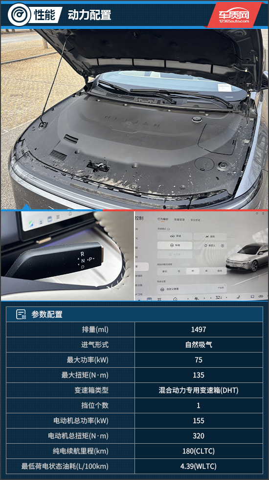 评测车搭载AI云擎电混系统,由1.5L自然吸气发动机与前置单电机组成,发动机最大功率75kW,最大扭矩135N·m;电动机总功率155kW,总扭矩320N·m,CLTC纯电续航里程180km。