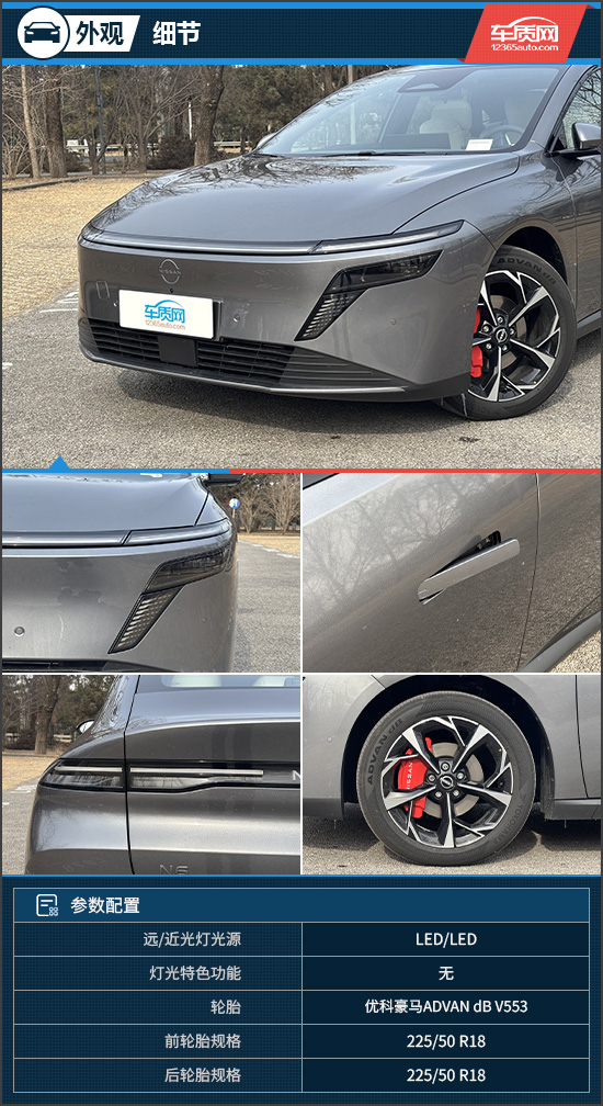 车身侧面线条舒展,风弧式极简腰线自车头延伸至车尾,勾勒出流畅而富有动感的车身姿态,隐藏式门把手的加入有助于进一步优化整车风阻表现。车尾造型简洁开阔,飓风之眼尾灯与可点亮的品牌标识相融合,为整车增添了浓厚的科技气息。此外,评测车配备18英寸低风阻花瓣式轮毂,造型凌厉,运动感十足;匹配的优科豪马ADVAN dB V553系列轮胎在静音性、湿地性能及舒适性方面均有不俗表现。