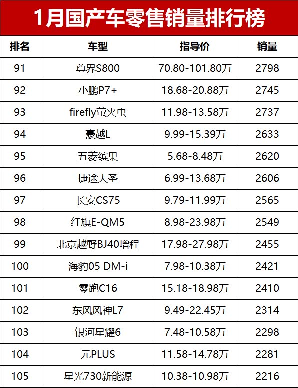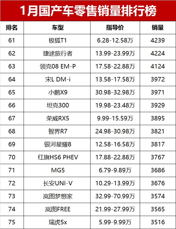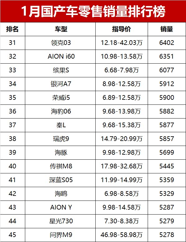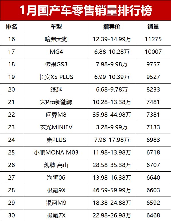 整体来看,2026年开年第一个月,车市就受到节前消费提前释放、节后淡季等多重影响,国产车整体销量同比下滑明显。高端新能源继续向上冲,小米YU7、问界M7、蔚来ES8站稳中高端市场;家用SUV和轿车依旧是销量基本盘,博越L、星愿、帝豪、长安CS75PLUS等车型扛起大旗。