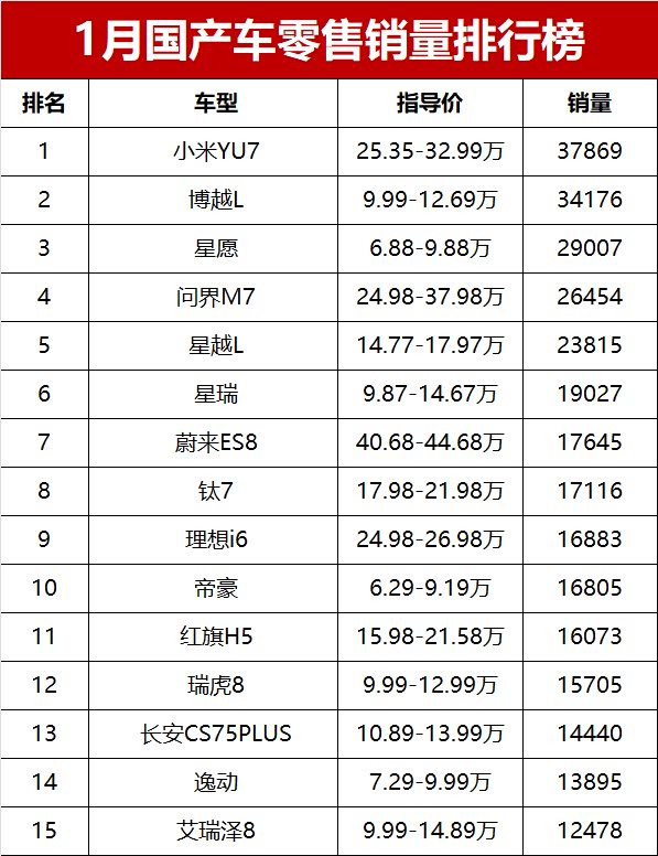 具体来看,1月国产车销量破万的只有17款,覆盖SUV、轿车、新能源多个细分市场。作为参考,上月销量破万辆的国产车达到36款车型,1月份“万辆俱乐部”车型连上月的一半都还没到。小米YU7以37869辆的成绩直接拿下第一,成为1月国产车销量冠军,在高端新能源市场号召力相当惊人。