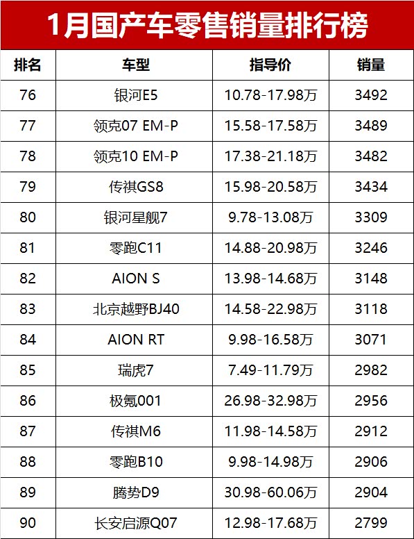 问界M7依旧是高端新能源SUV里的大热门,1月销量26454辆,位列第四。吉利星越L定位家用品质SUV,销量23815辆,排名第五。同品牌的星瑞以19027辆排在第六,是国产轿车里的主力担当。值得一提的是,1月份吉利汽车共有5款车型进入国产车销量榜的前十榜单,成为本月乘用车市场上的最大赢家。