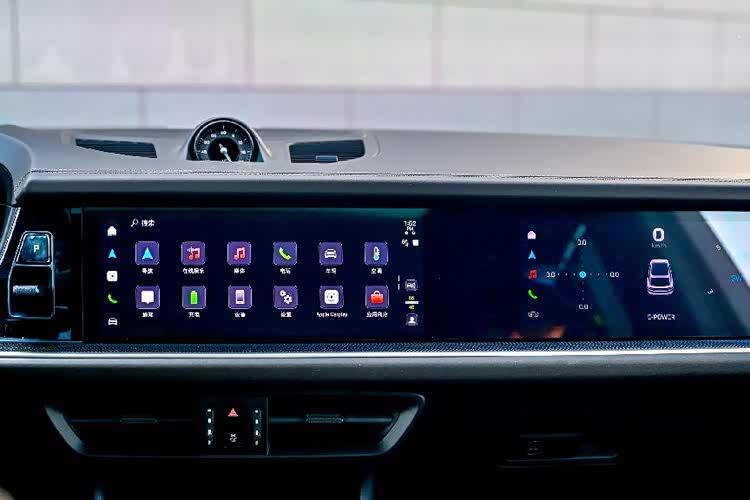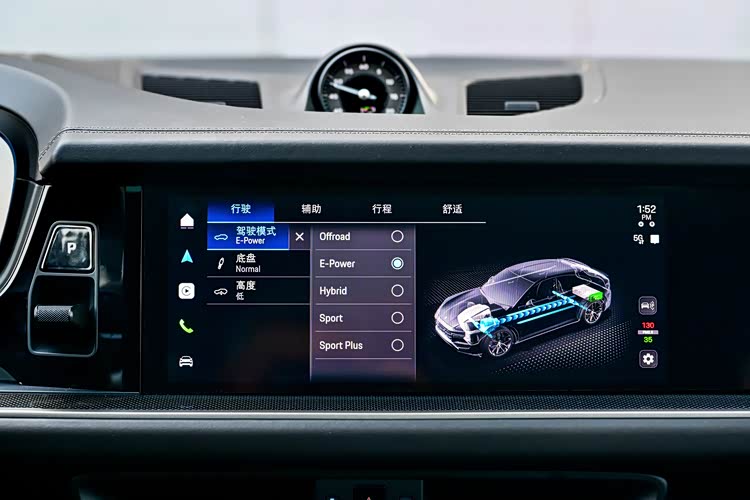 按下START按键,随着仪表盘中的数字跳动,整套插电式混动系统悄无声息地启动,无一丝杂音。内饰设计可谓是在延续了经典的同时有所突破,12.6英寸悬浮式弧面液晶仪表盘、12.3英寸中控屏幕以及10.9英寸副驾驶显示屏组成了全新样式的科技联动座舱。尽管无法与新能源车时下流行的大屏幕相比,但是在显示效果、操作响应时间以及菜单逻辑方面都挑不出任何问题。重要的是,依然保持了极具保时捷特点的UI设计,驾驶者可以通过方向盘右侧旋钮对仪表盘进行7种样式选择,从极简风格到五连表的经典风格,可谓应有尽有。中控屏内置保时捷通讯管理系统,通过4G网络可以实现导航、影音娱乐到语音交互都为驾乘者提供了极大的便利性和舒适性。