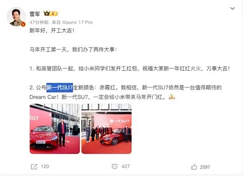 雷军称:新一代SU7依然是一台值得期待的Dream Car!新一代SU7,一定会给小米带来马年开门红。