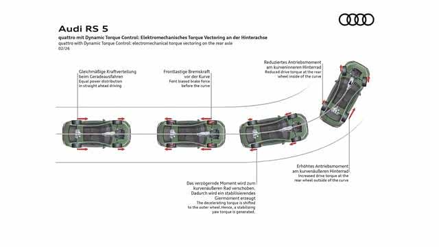 比纯电续航与零百加速,更加重要的是,全新RS5通过匹配8速Tiptronic变速箱以及一套全新的quattro四驱系统,可实现专属的后驱模式,让车辆可以完成包括漂移在内的“技巧性操作”。当然,RS5实际上无法做到完全后驱化,扭矩适量分配更多是为了平衡车辆在机械操纵中的车身稳定性,这使得它能配合可锁止差速器,实现最高70%前桥扭矩输出或85%后桥扭矩输出,这种操控上的平衡、平稳,其实也是奥迪Sport的特点之一。