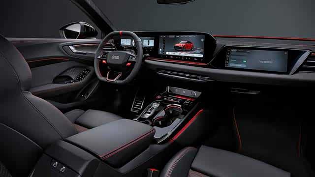 从侧后方向上来看,除了车辆本身的第二代数字OLED尾灯外,车辆更多套件在后向、侧向都产生了一定宽体效果。像侧身上,车辆就拥有独立运动侧裙与防刮蹭条;而前侧翼子板则有前制动系统的冷却散热孔,都在为动态性能做准备。更醒目的是,尾箱盖上出现了小尺寸独立尾翼,而后保险杠中不仅有纤维纹理装饰的运动包围,更提供了立刀式扩散器与超大号的双边共两出排气管,后者相对居中的布局方式,会让人联想到一些经典的中置布局跑车,既要性能上的增强,也要视觉上的夸张,这倒是跟奥迪长久以来的低调路线有了一些明显区别,个性度完成了一次关键爬升。