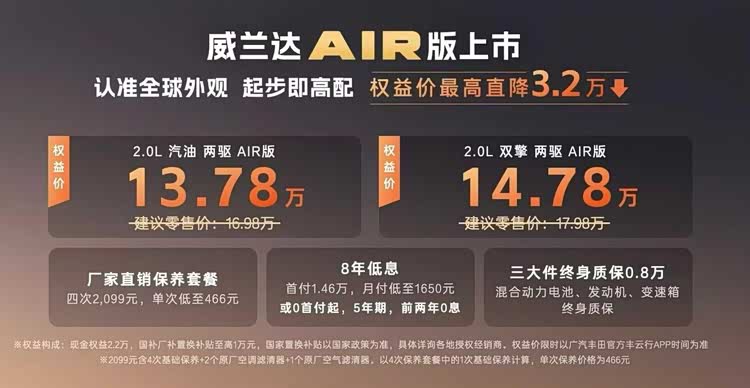 就在今日,广汽丰田突然扔出一张牌:全新 威兰达(参数|询价)AIR版正式上市,2.0L汽油版权益价13.78万,双擎混动版14.78万。这还没完——发动机、变速箱、动力电池终身质保,8年超长低息,首付1.46万月供1650元。