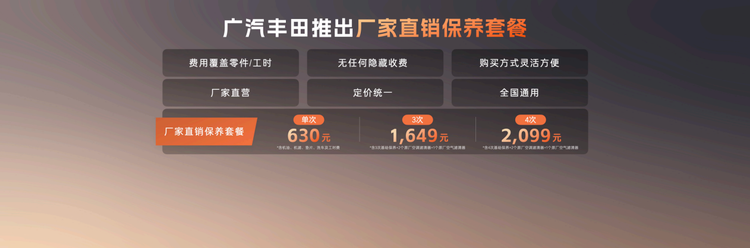 养车环节,广汽丰田推出“厂家直销保养套餐”,仅需2099元就能购买4次原厂保养,价格低至市场价七五折,且无隐藏收费。该套餐采用原厂直供零件,遵循全球技术标准保养检测,全程在厂家授权4S店进行,全国通用,让养车透明无忧。