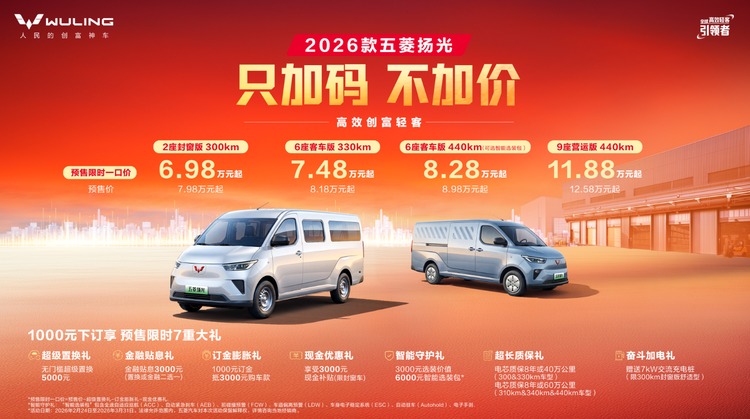 高效可靠,创富好帮手!2月24日,新能源轻客销冠五菱扬光家族迎来焕新升级——2026款五菱扬光正式预售。作为高效创富轻客,新车实现了“续航、动力、智能”三大维度升级,以“只加码不加价”的诚意定价与越级产品力,定义新能源高效轻客标准,致力于成为城配市场货运司机群体的创富首选。