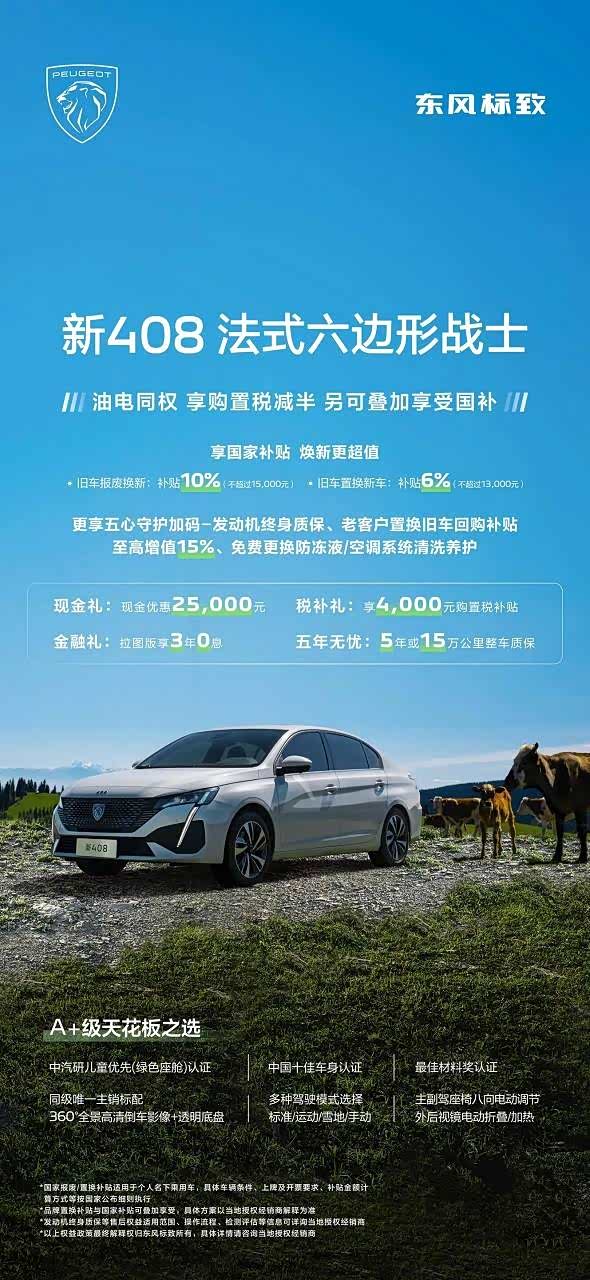 在此丰厚权益之上,东风标致再献重磅诚意:凡在3月18日前购新 408 可享品牌直补至高 2500元,以实实在在的让利,进一步降低购车门槛,让用户以更优预算,轻松坐拥这款实力出众的合资高品质家轿。