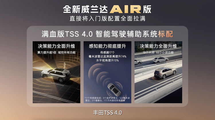 值得一提的是,全新换代威兰达AIR版标配丰田TSS 4.0智能驾驶辅助系统。相较3.0版本,TSS 4.0升级⾄26⼤项、53⼩项功能,覆盖超过200个功能场景,传感器数量增⾄24个,前向摄像头像素提升⾄830万,探测距离达280⽶。从上⻋出发到下⻋离⻋,提供全场景的安全驾驶辅助。低速场景,像⽼司机⼀样,时刻提前与前⻋预留安全距离。⾼速场景,隔⻋也能预判减速,避免危害最⼤的多⻋连环追尾事故。泊⻋场景,垂直和⽔平⻋位均⽀持⻋头或⻋尾进⼊的⾃动泊⻋及遥控泊⻋。突发场景,⾏业⾸创驾驶员失能紧急停⻋功能,关键时刻都能为你把控⻋辆平稳停下。