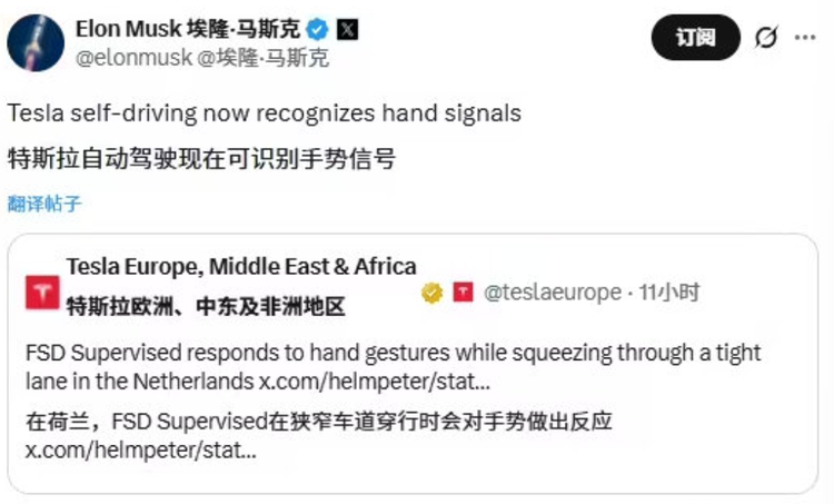 马斯克看到这视频后,立马在自己的账号上转发并确认:“特斯拉自动驾驶系统现在可以识别手势信号了。” 这下算是官方实锤了。
