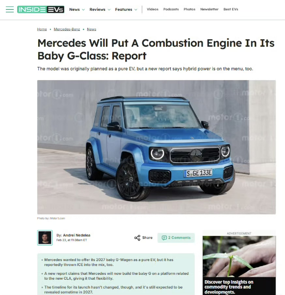 为什么突然加回燃油?事情要从头捋一捋。奔驰最早在2023年确认要推一款“小G”,定位比现款G级小一圈,当时说的是纯电专属。但这两年市场风向变了,纯电G级销量没达到预期,欧洲2035禁燃令也松了口。奔驰CEO康林松明确表示,燃油车要“卖到2030年代中后期”,保持战略灵活性。说白了,不是不想纯电,是市场还没准备好全盘接受。给消费者多一个选择,总比一条路走到黑强。