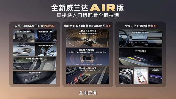 马年开工第一天,广汽丰田正式发布全新威兰达AIR版的价格:在原价16.98-17.98万元的基础上,给出3.2万元综合权益,2.0L汽油AIR版最终权益价13.78 万、2.0L混动AIR版最终权益价14.78 万。