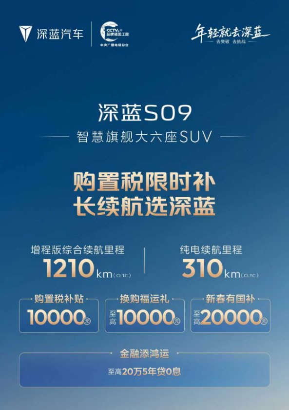 因此,对于部分中产家庭来说,现在买家用座驾肯定希望这台车在空间、舒适、驾控、智能等方面有均衡表现才行,最好再有亲民价格和给力权益,才能满足全家人多场景的用车需求。而当下大六座市场中, 深蓝S09(参数|询价),就靠着过硬的产品品质和诱人的购车政策,成为过年返乡的合适选择。