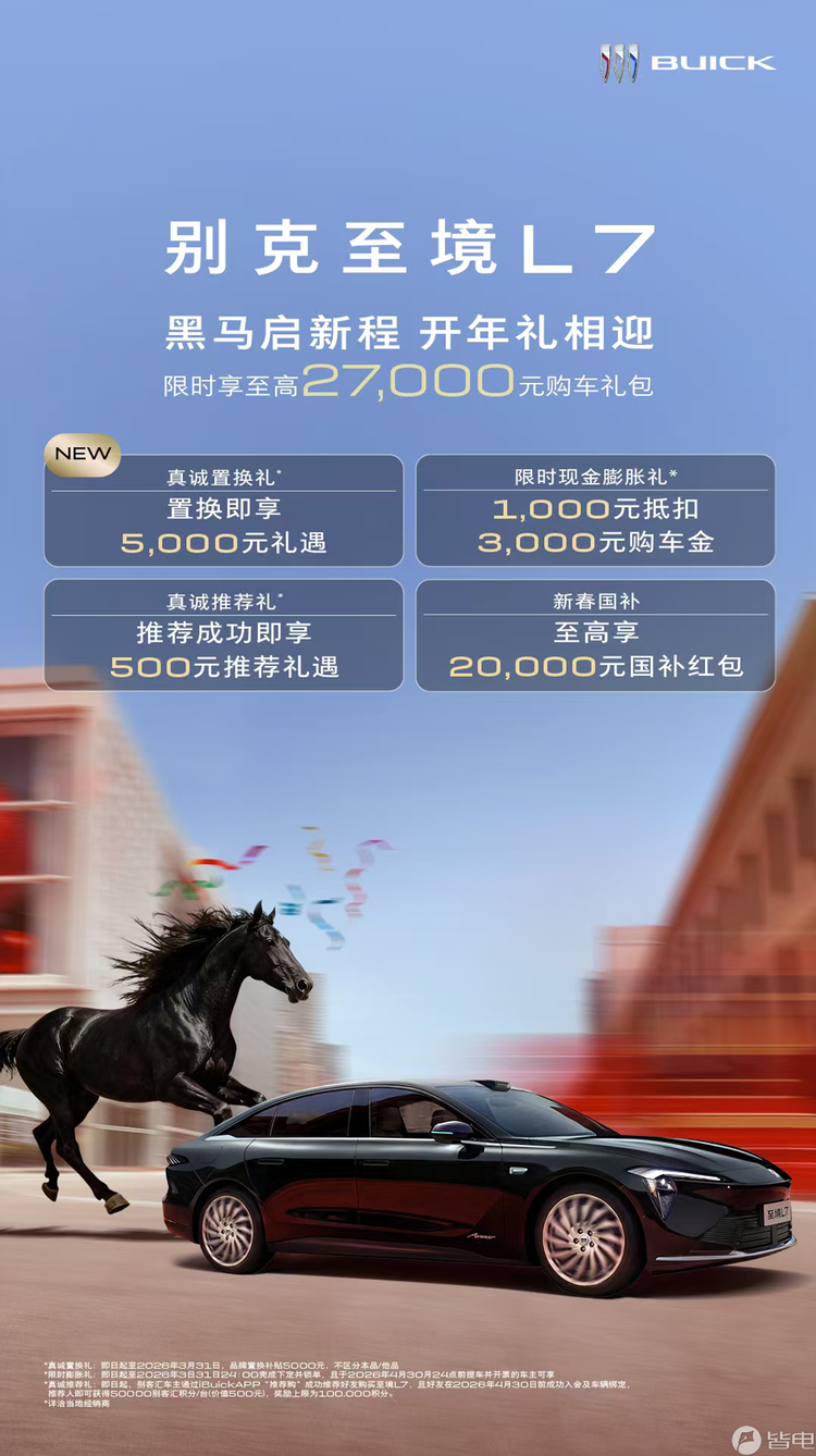 车家号·0浏览·2026-02-24 16:15 · 广东2月24日, 别克至境L7(参数|询价)官宣推出限时购车权益,即日起至2026年3月31日,购买别克至境L7可享至高27000元购车大礼包。此外在2月28日前,2026年2月内领证的夫妻下定别克全系任一车型并完成核销开票,即可获得别克10000元随礼抵扣金。