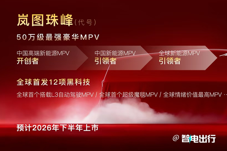 岚图在梦想家之后将继续向高端MPV市场进发,代号“珠峰”的新车预计下半年上市。定位50万级别。其将首搭L3级自动驾驶和三腔空悬,再加上华为的乾崑智驾和鸿蒙座舱,主打智能化与豪华体验。