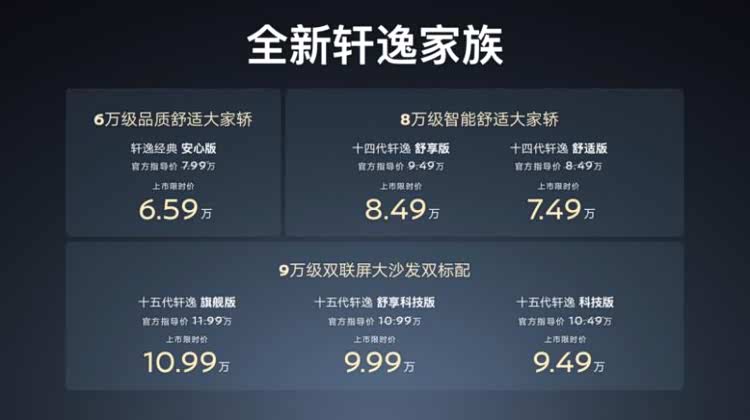 十五代轩逸上市后,与轩逸·经典、十四代轩逸联袂打造全新轩逸家族,满足中国家庭多样化需求。其中,6万买轩逸・经典,品质纯粹,可靠又舒适,安心之选;8万买十四代轩逸,兼顾智能科技与驾乘质感,舒适之选;9万买十五代轩逸,双联屏大沙发双标配,定义智能家轿新高度,智慧之选。对于中国家庭来说“选家轿,必有一款轩逸,适合你!”