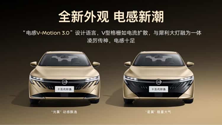 十五代轩逸采用全新电感V-Motion3.0设计语言,V型格栅与犀利大灯融为一体,凌厉传神。同时,新车提供“光翼”与“星翼”双前脸,前者动感飘逸,后者稳重大气,搭配“萤石金”“炽岩红”等五种高级车色,满足多元审美。宽体低趴车身搭配流畅溜背线条,尾部贯穿式灯组点亮后辨识度拉满,科技感与优雅感兼具。