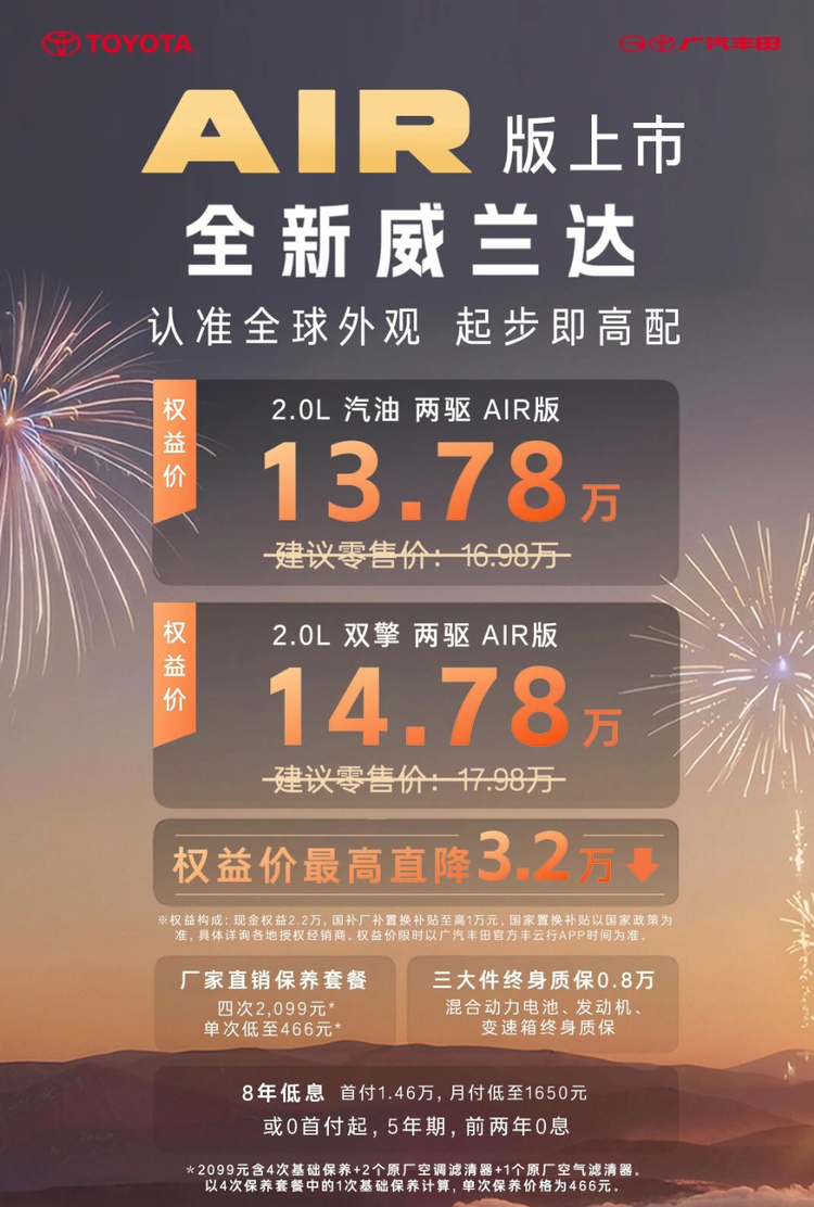 2月24日,广汽丰田推出全新威兰达AIR版,2.0L汽油、2.0L双擎混动两款车型,官方指导价:16.98万-17.98万元,叠加上市权益直降3.2万元后价格为:13.78万-14.78万元,并支持三大件终身质保。