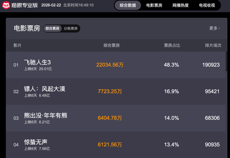 截至目前,根据猫眼专业版的数据,由沈腾主演的《飞驰人生 3》,综合票房已经超过 25 亿,远在同期上映的《惊蛰无声》《镖人:风起大漠》之上,称得上 2026 年春节档的现象级爆款。