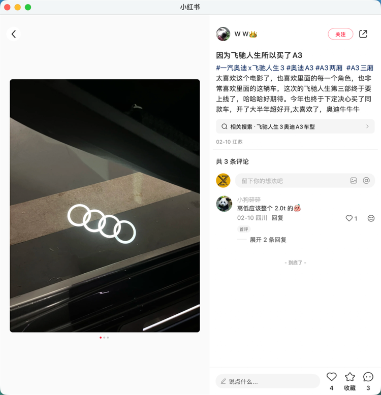 作为《飞驰人生 2》和《飞驰人生 3》两部电影的「主角车」奥迪 A3,目前并没有官方数据指出电影对车型销量的助益,但在社交平台中可以发现,有部分网友因为看了电影,买了奥迪 A3。