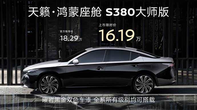 颜值方面,天籁·鸿蒙座舱S380大师版采用曜岩黑金双拼色车身,其灵感源自火山玻璃黑曜岩与金色矿脉,以毫米级工艺分割腰线,勾勒出百万级豪车同款的黑金美学。车内采用灵感源自日落霞光的曜夜黑红内饰,彰显飘逸洒脱气质。