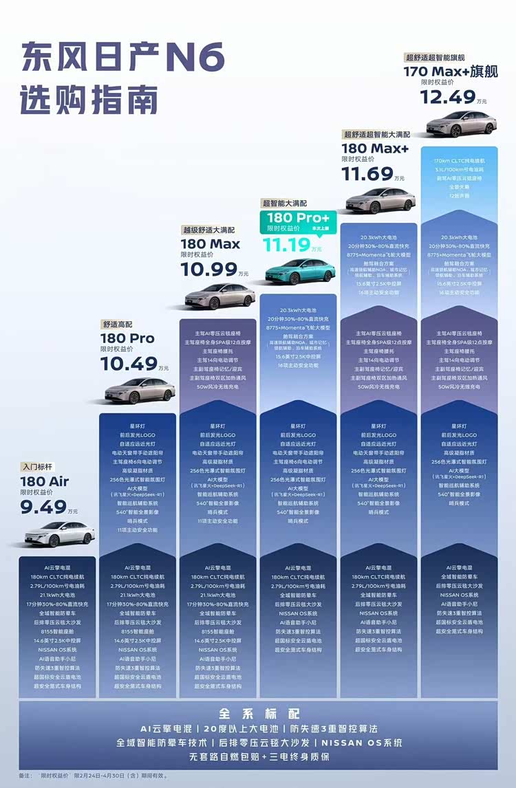 作为东风日产旗下的插混中型轿车,日产N6最早于2025年12月初推出。而随着180 Pro+版本的加入,目前日产N6全系可选6款车型,整体指导价格区间为9.99万-12.99万元,限时价9.49万-12.49万元。