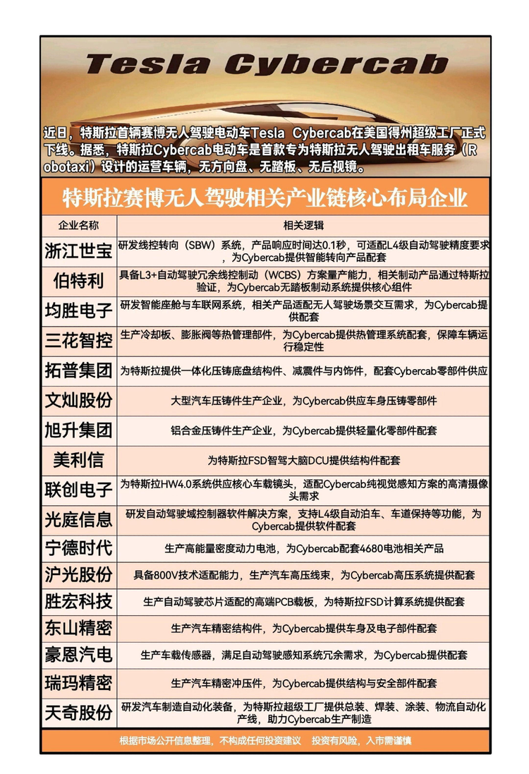 Cybercab下线的锤音刚落,资本市场的掌声便已雷动。浙江世宝的暴涨绝非孤立事件,它反映了全球资本对自动驾驶商业化进程陡然加速的强烈预期。