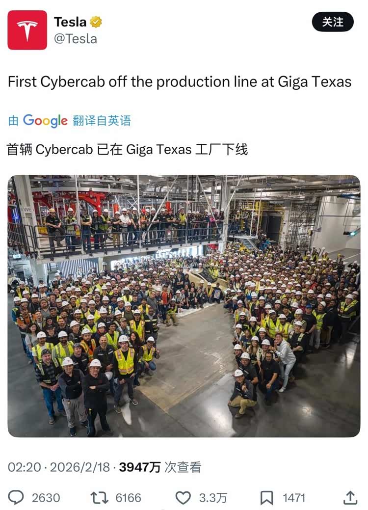 这背后,是一则从大洋彼岸传来的、足以让整个出行行业“心头一紧”的消息:特斯拉的 Cybercab(参数|询价),那台传说中既没方向盘也没刹车踏板的纯无人驾驶出租车,首台量产车已于2月18日在美国得州超级工厂正式下线。