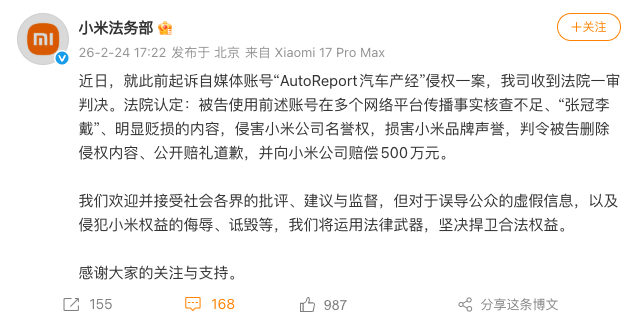 车家号·0浏览·2026-02-24 18:36 · 北京2月24日,小米法务部发文称,近日,就此前起诉自媒体账号“AutoReport汽车产经”侵权一案,我司收到法院一审判决。
