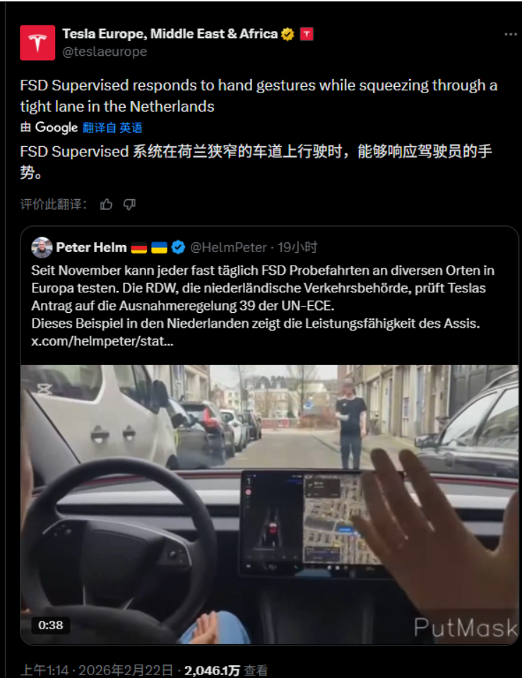 车家号·0浏览·2026-02-24 18:58 · 广东2月21日消息,特斯拉欧洲、中东和非洲官号@teslaeurope发布FSD Supervised最新测试视频。系统在荷兰狭窄车道行驶时,实时识别并响应人类手势信号,前进或停止判断如人类司机般自然。