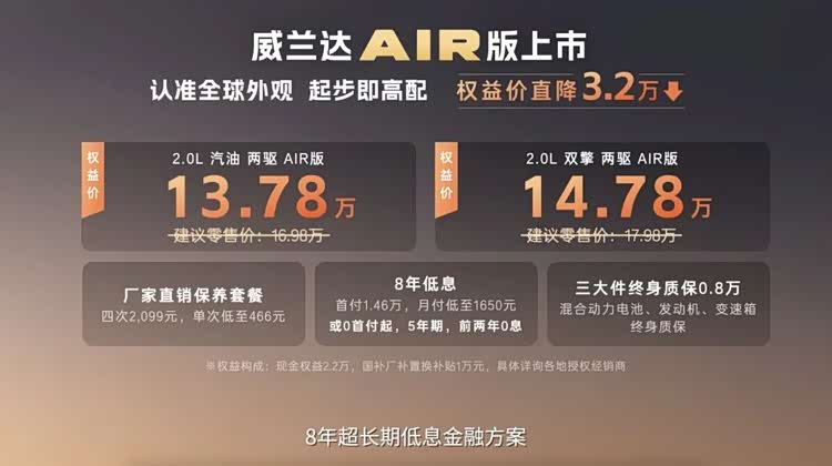 农历正月初八,新春之后开工第一天,广汽丰田以一场线上发布会打响2026年车市第一枪。全新换代 威兰达(参数|询价)AIR版上市,这款被誉为“全球车新春大礼包”的车型,不仅以2.0L汽油版13.78万元、2.0L混动版14.78万元的权益价(直降 3.2 万元)击穿合资紧凑型 SUV 价格底线,更以“入门即满配”的产品逻辑、行业首创的透明保养体系,重新定义13-15万级SUV市场的价值标杆。