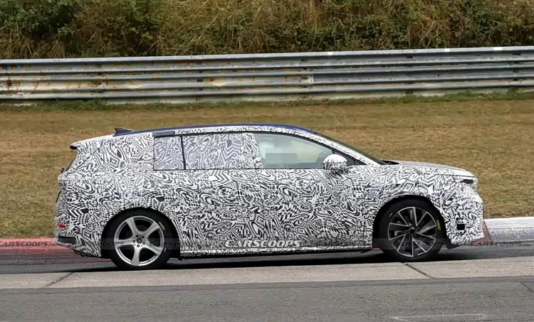 侧面是其“非传统SUV观感”的主要来源。A柱倾角明显偏大,车顶线条更平缓延伸,带来更强的流线型与空间导向;肩线与轮拱区域有一定隆起,尝试在柔和轮廓中补足力量感。车顶尾端可见小型扰流结构,用于拉长视觉比例并兼顾高速稳定性,但在现有轮廓下,会进一步强化“车身更长、更圆润”的整体印象。由于贴花覆盖,门把手、窗线细节与型面折线仍无法准确判断。