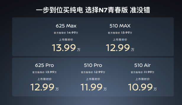 纯电市场再添爆款,N7青春版以10.99万元—13.99万元限时价上市,让更多家庭轻松拥有越级纯电体验。作为天演架构下首款新能源战略车型,N72025年收获5万家庭青睐,用户净推荐值位列中大型纯电轿车第一。N7青春版延续极简至美设计,2915mm超长轴距带来83%高得房率,实现“A级价买B级车,享C级大空间”的越级体验。