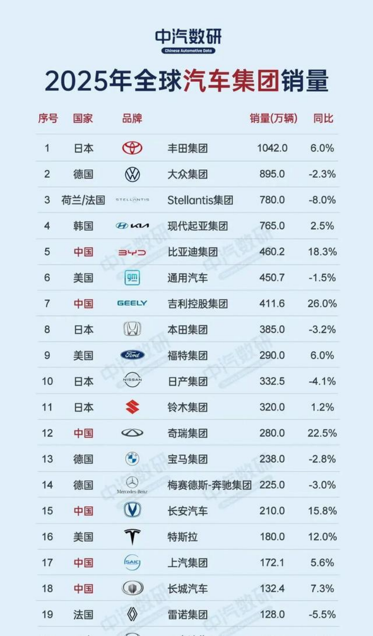 全球车圈2025年5%的销量增幅,虽然谈不上激进,但也算是结束了连续两年的增速低迷,甚至有些温和复苏的感觉。而比这次的状态回归更令人眼前一亮的是,比亚迪、吉利、奇瑞三家中国车企跻身前十,打破了头部榜单长期被德系、欧美日韩等车企霸榜的格局。