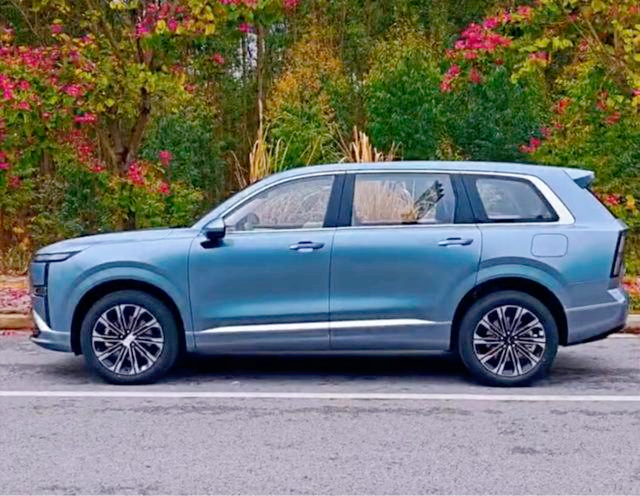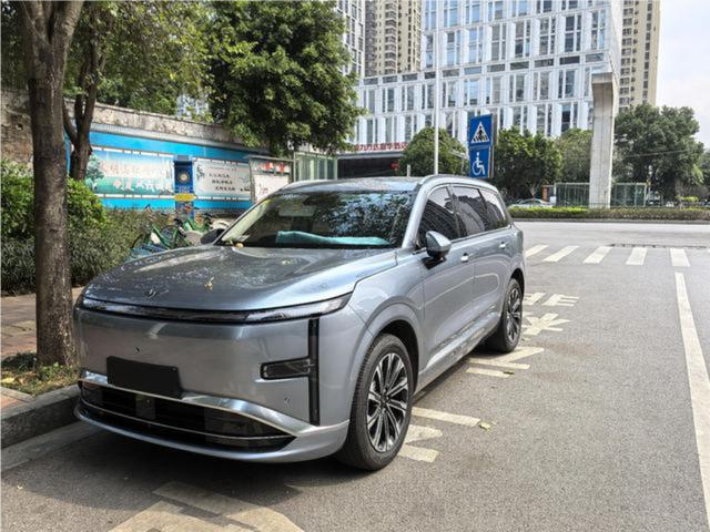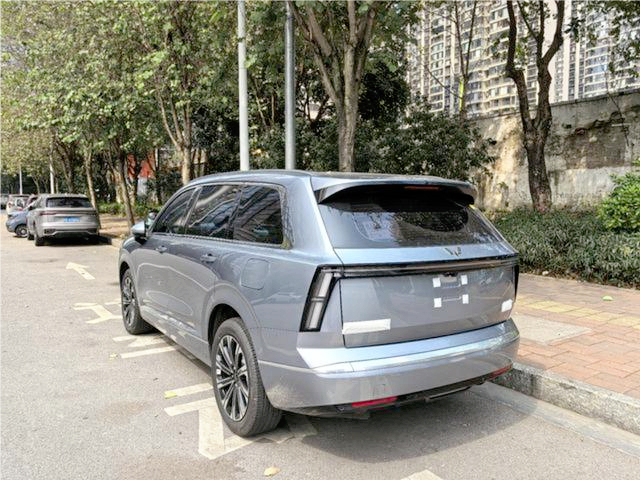 首先说说这车的一个尺寸,长宽高分别为4980毫米,1930毫米,1760毫米,轴距2950毫米,比理想L6和零跑C16都要大上一圈。站路边绝对是那种让人忍不住多看两眼的大家伙。前脸那个贯穿式的星环灯带,往下还延伸出T字形的灯组,配上大面积的梯形格栅,看着就十分的有排面。