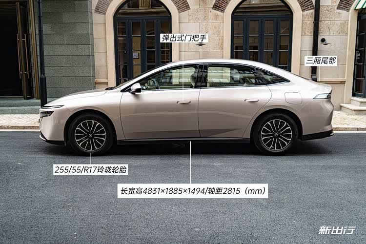 车身侧面,日产 N6 车身尺寸为 4831mm×1885mm×1494mm,轴距达 2815mm。