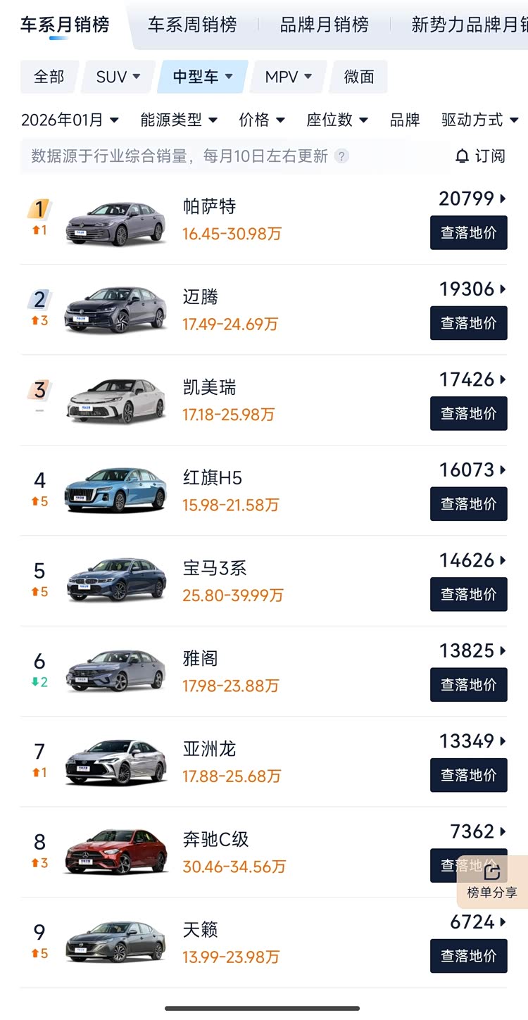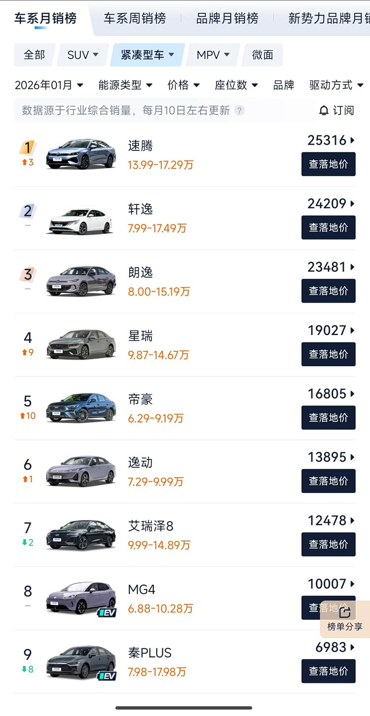 车家号·0浏览·2026-02-25 00:40 · 北京挺有意思的!1月的轿车销量排行一眼看上去全是燃油车,本来油车的市场份额一直在缩水,去年新能源的渗透率都到50%了,补贴一退坡新能源马上就被打回原形了,前几没看见特斯拉还能理解,毕竟特斯拉把产能都拿去出口了,比亚迪系列竟然也找不到了,海豚海鸥 秦PLUS(参数|询价)啥的怎么都掉到五六千这个级别了,原来比亚迪都是月销几十万的头把交椅?!我分析这其实有2个原因: