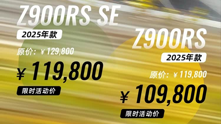 川崎Z900RS所销售为2025款,该车会有两个版本,降幅为10000元,其中Z900RS活动价109800元、SE版119800元。