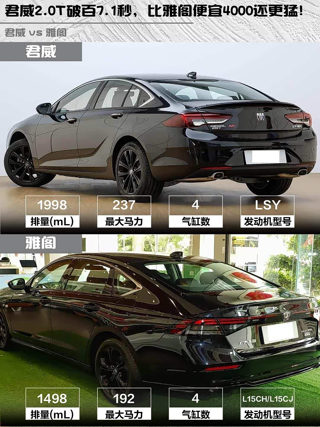 君威的2.0T发动机237马力+9AT变速箱,实测7.1秒破百,高速超车推背感直接拉满!雅阁1.5T地球梦192马力配CVT,平顺性没得说,但急加速时发动机声音会稍微有点大。喜欢驾驶激情的建议试驾下君威,那种350N·m扭矩爆发的感觉真的上头~