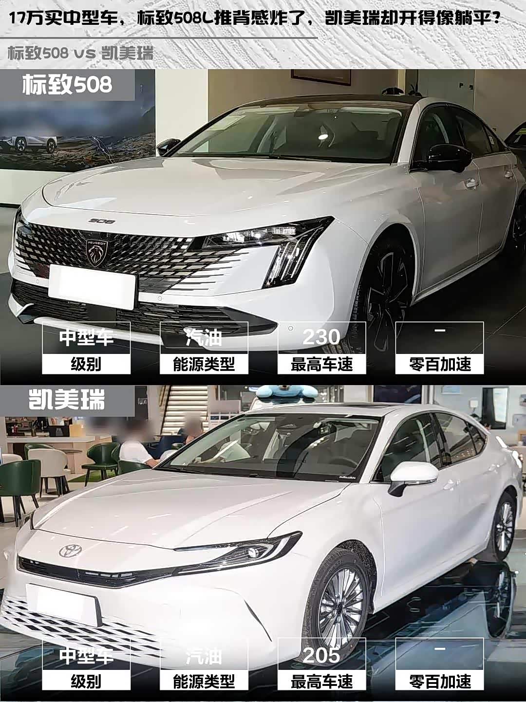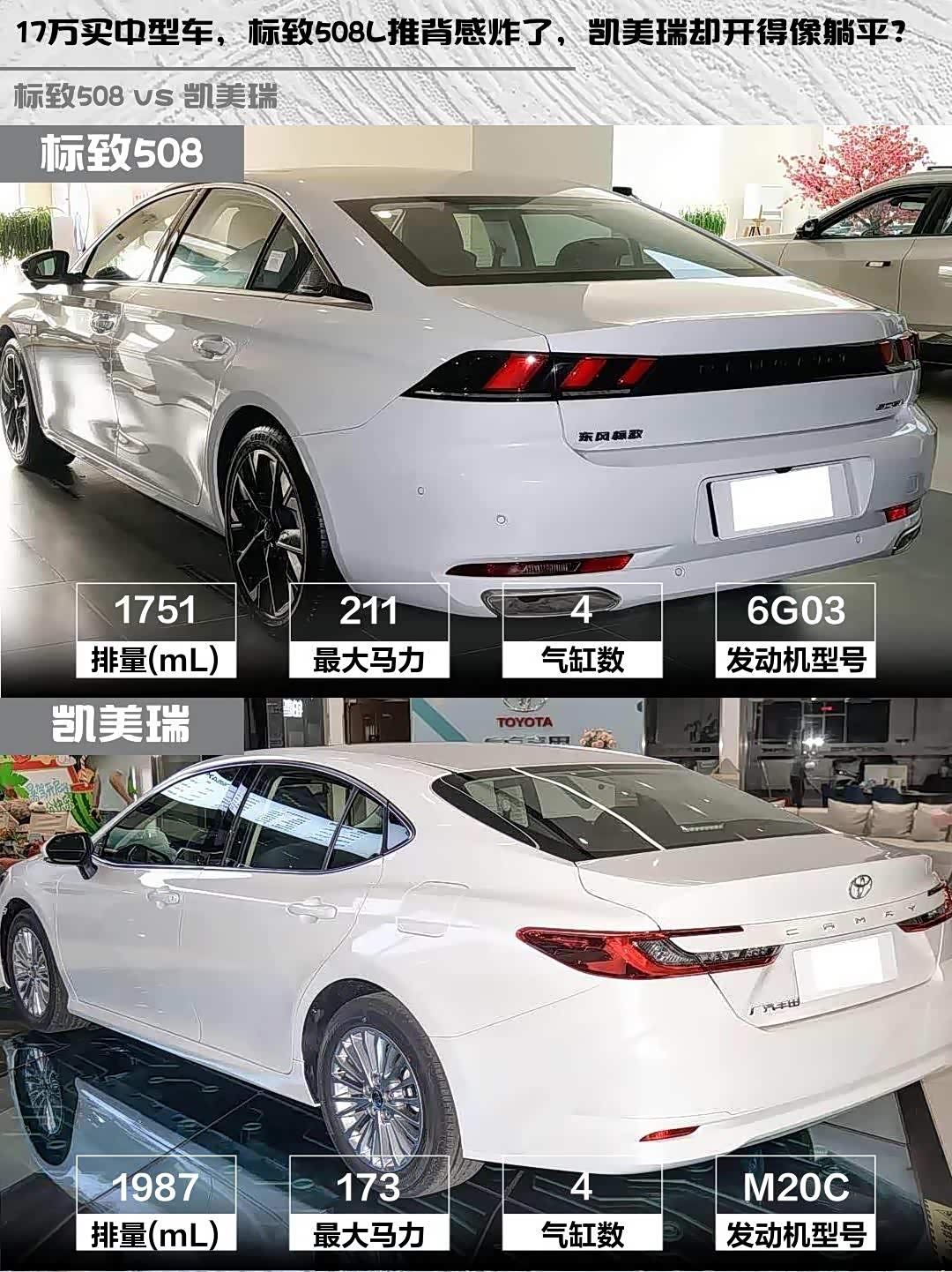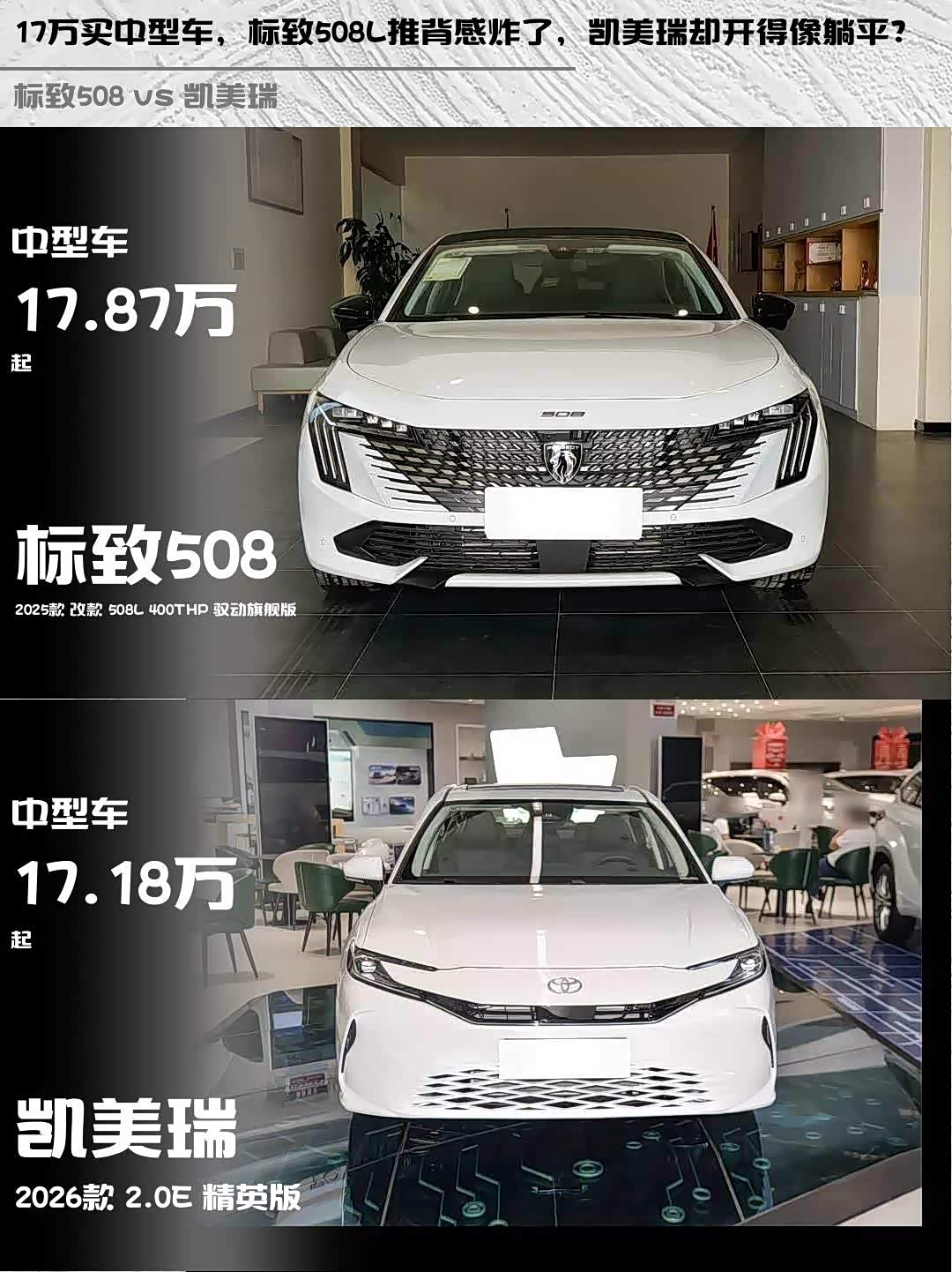 最近试驾了2025款 标致508(参数|询价)L 400THP驭动旗舰版和2026款凯美瑞2.0E精英版,两款都是17万价位的中型车,但性格完全不同!分享一下真实感受给纠结的兄弟们👇