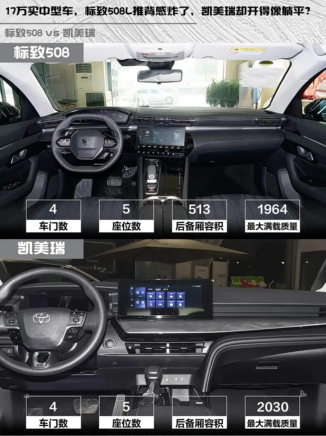 要驾驶激情选508L:1.8T动力+魔毯悬架+无框车门,17.87万配真皮座椅加热/通风,性价比炸裂。要省心保值选凯美瑞:油耗5.81L/百公里+三年10万公里质保,后期养护成本低不少。